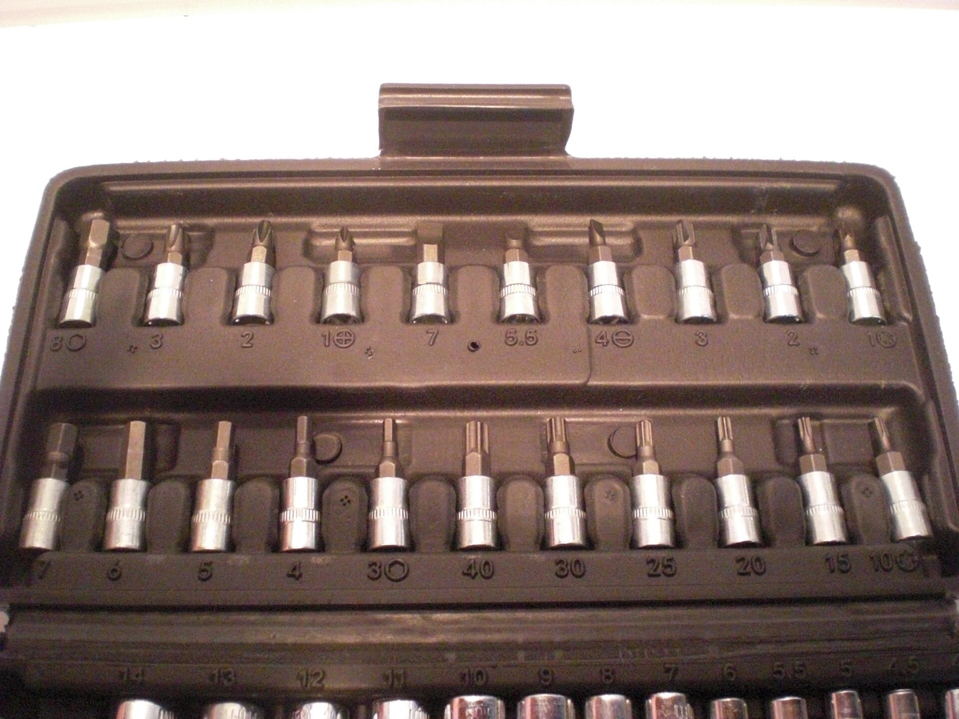 21 Bit Sockets : SL4, 5.5, 7 / PH1, 2, 3 / PZ1, 2, 3 / Hex3, 4, 5, 6, 7, 8 / T10, 15, 20, 25, 30, 40