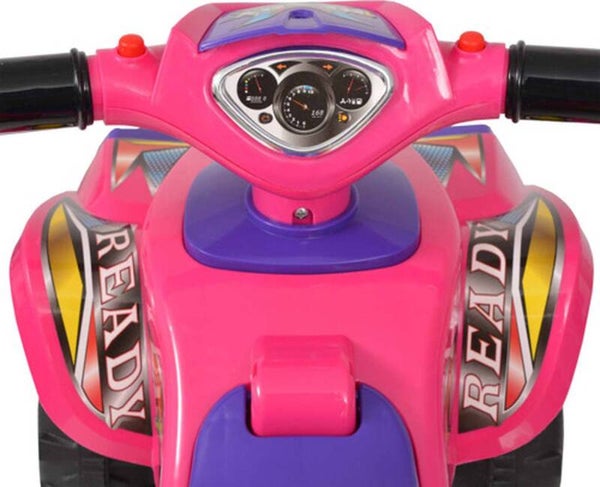 De quad heeft een comfortabel zitje met opbergruimte en handvatten met een claxon.