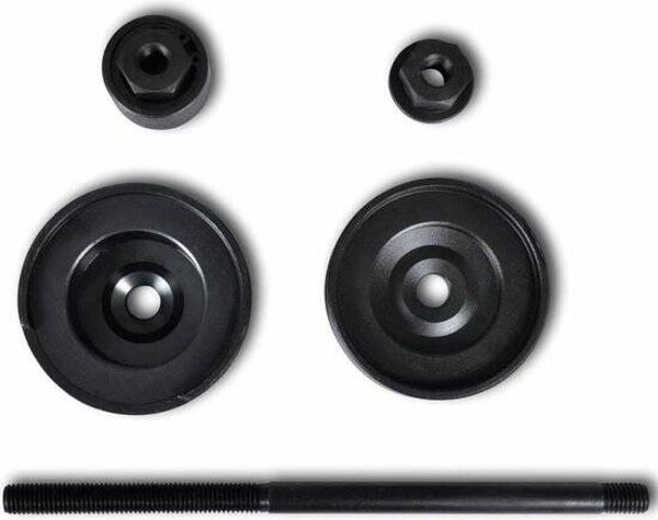 1 drukmoer, 84 mm in buitenste diameter, 20 mm hoogte, 76 mm binnenste diameter, binnenste gat 49 mm in diameter, 6 mm hoogte 1 drukmoer, 84 mm in buitenste diameter, 34 mm hoogte, 76 mm binnenste diameter, binnenste gat 49 mm in diameter, 23 mm hoogte 1 staaf, 240 mm lengte, M12 x 1.75 mm, samendrukbaar tot 46 mm lengte 1 moer met kogellagers voor persdruk stuk met schroeven, inbussleutel, steeksleutel 24 mm 1 moer voor die stuk op de staaf houdt, inbussleutel, steeksleutel 24 mm.